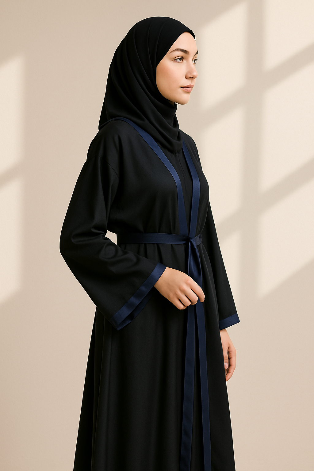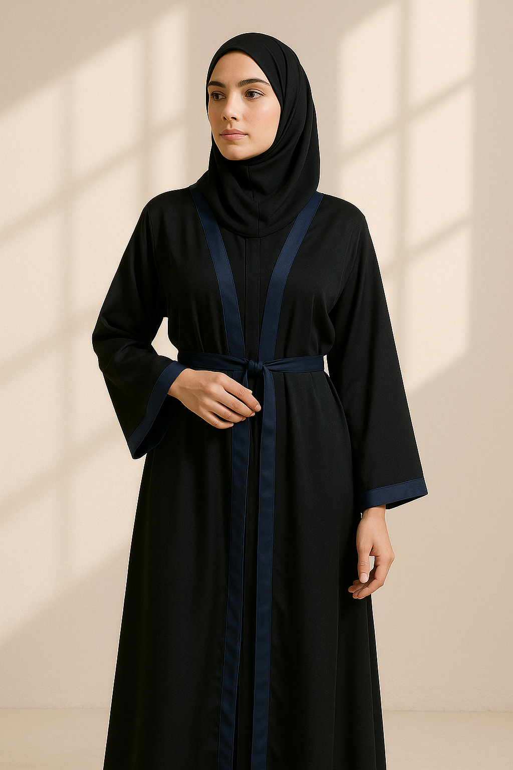 This Full Length Tich Button V-Neck Black Abaya features a striking dark blue strip and rope detail, adding a touch of elegance to its classic design. Crafted from 100% shining fabric, it offers a luxurious feel while ensuring durability and comfort. The V-neck design and tich button closure combine practicality with style, making it perfect for both casual and formal occasions.